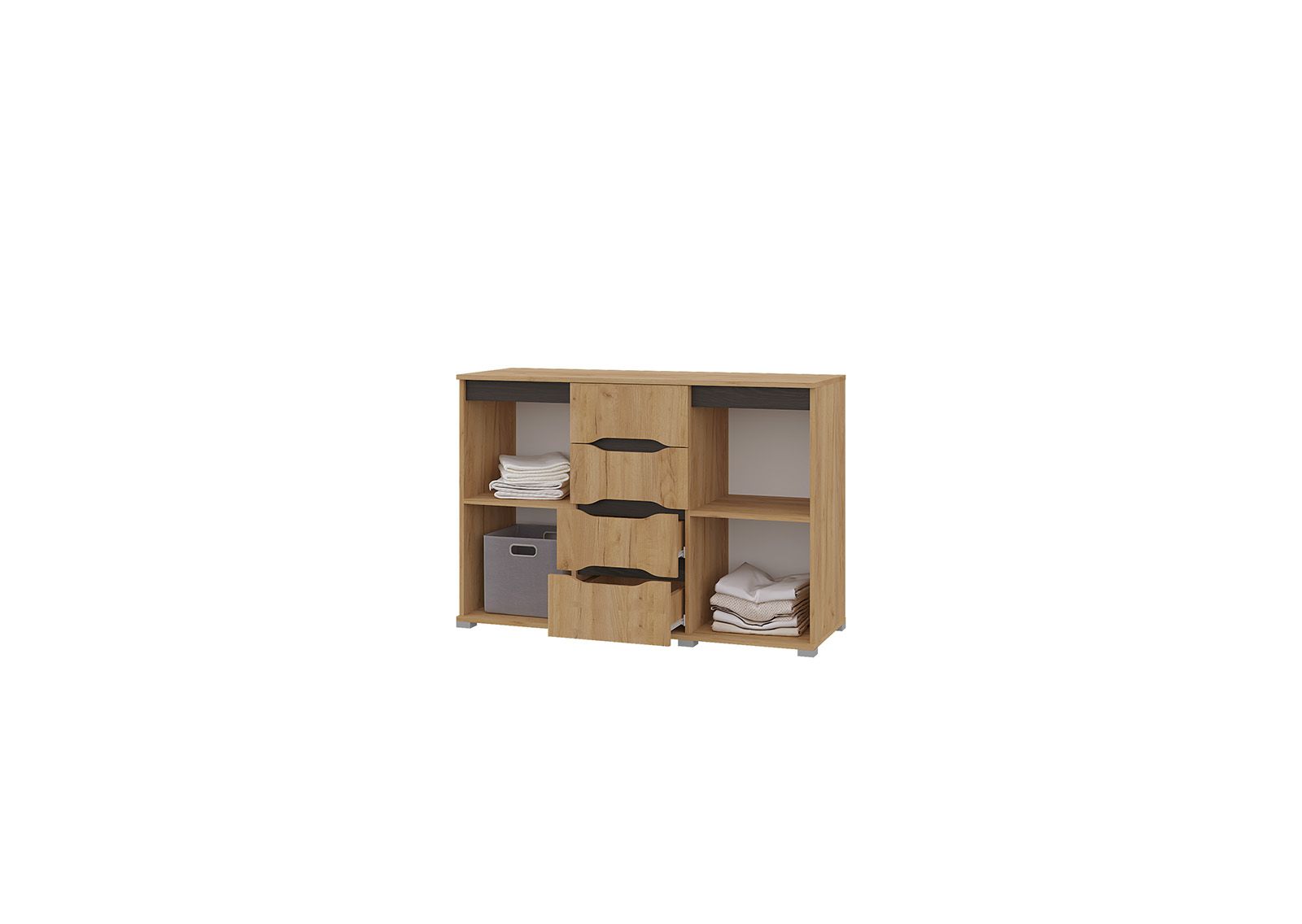 Комод имеет несколько ящиков, которые идеально подходят для хранения одежды, постельного белья и других вещей. Также на верхней части комода можно разместить различные предметы декора, такие как фотографии, вазы или статуэтки. А также имеет секции с полками, которые существенно увеличивают его вместимость.