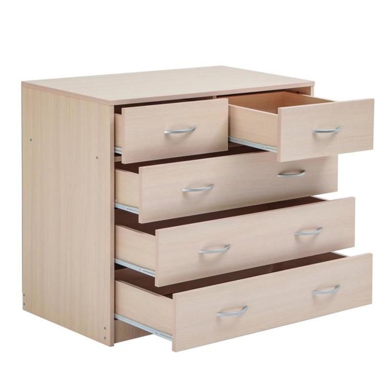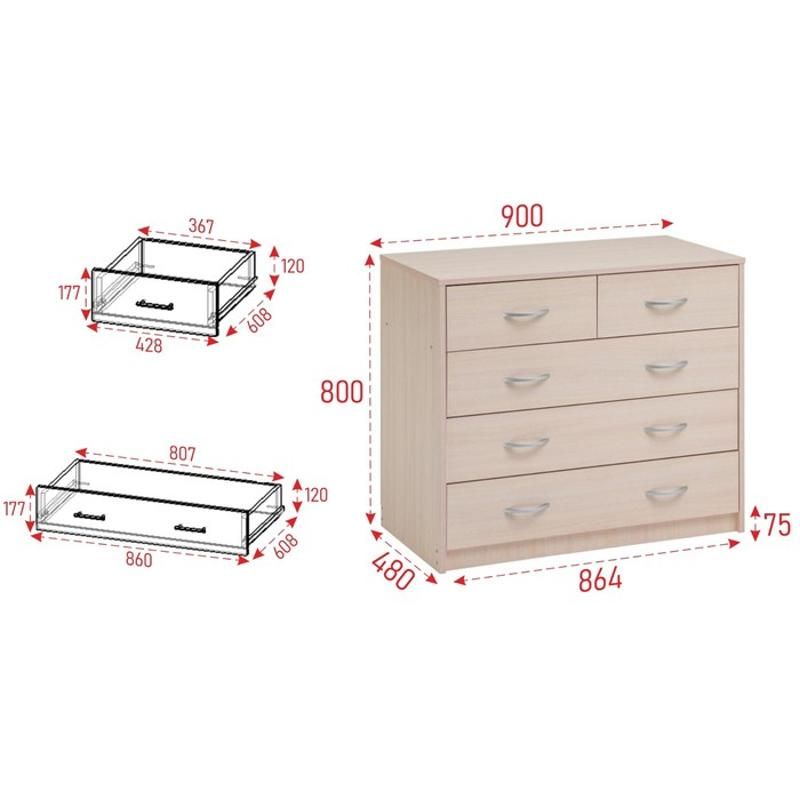 Комод имеет 5 роликовых ящиков, которые обеспечивают легкое открывание и закрывание. Они также имеют достаточно большой объем, что позволяет хранить в них много вещей. Габаритные размеры: ширина - 900 мм, глубина - 480 мм, высота - 800 мм.