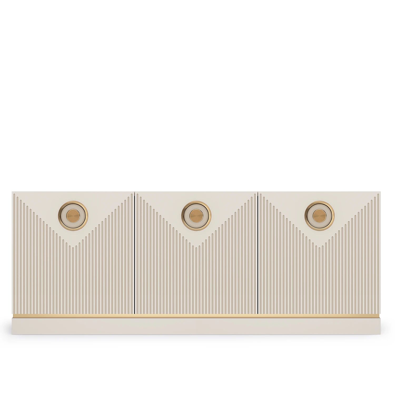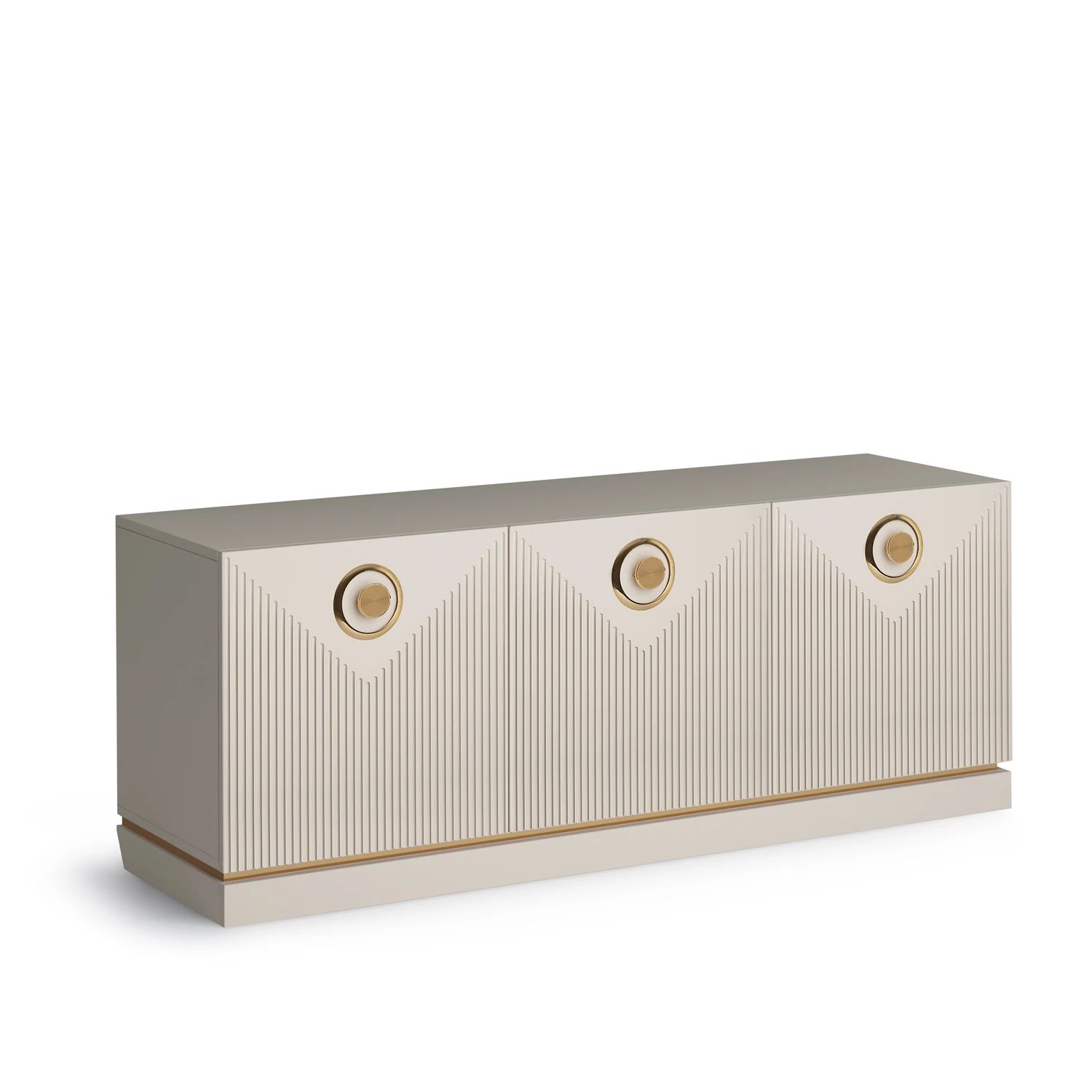 Оригинальный дизайн мебели подчеркивают эффектные металлические ручки в цвете глянцевое золото, золотая кромка, разделяющая корпус и цоколь, а также фрезеровка фасадов в виде параллельных тонких полос.