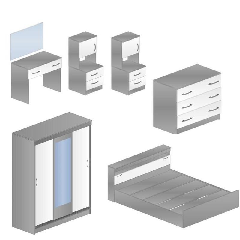 Комплектация * Комод: 800 х 820 х 440 мм. * Кровать: 1665 х 986 х 2235 мм. * Туалетный стол: 800 х 750 х 440 мм. * Тумба: 400 х 986 х 380 мм — две штуки. * Шкаф-купе: 1300 х 2020 х 520 мм. * Зеркало: 800 х 600 мм. |