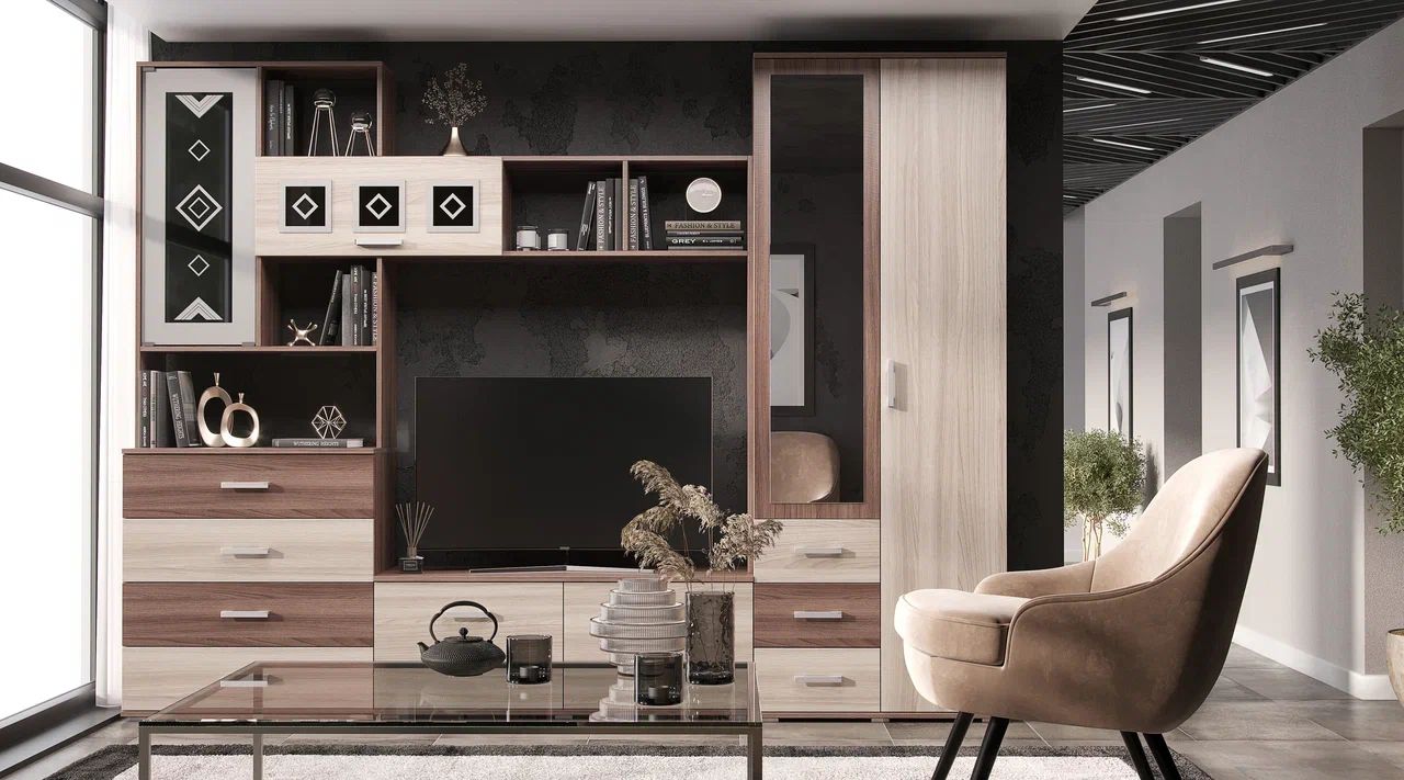 Особенностью этого набора является наличие полок и штанги, которые позволяют хранить различные вещи в удобном месте. Также стоит отметить, что максимальная ширина телевизора составляет 118 см, а максимальная высота - 101 см.