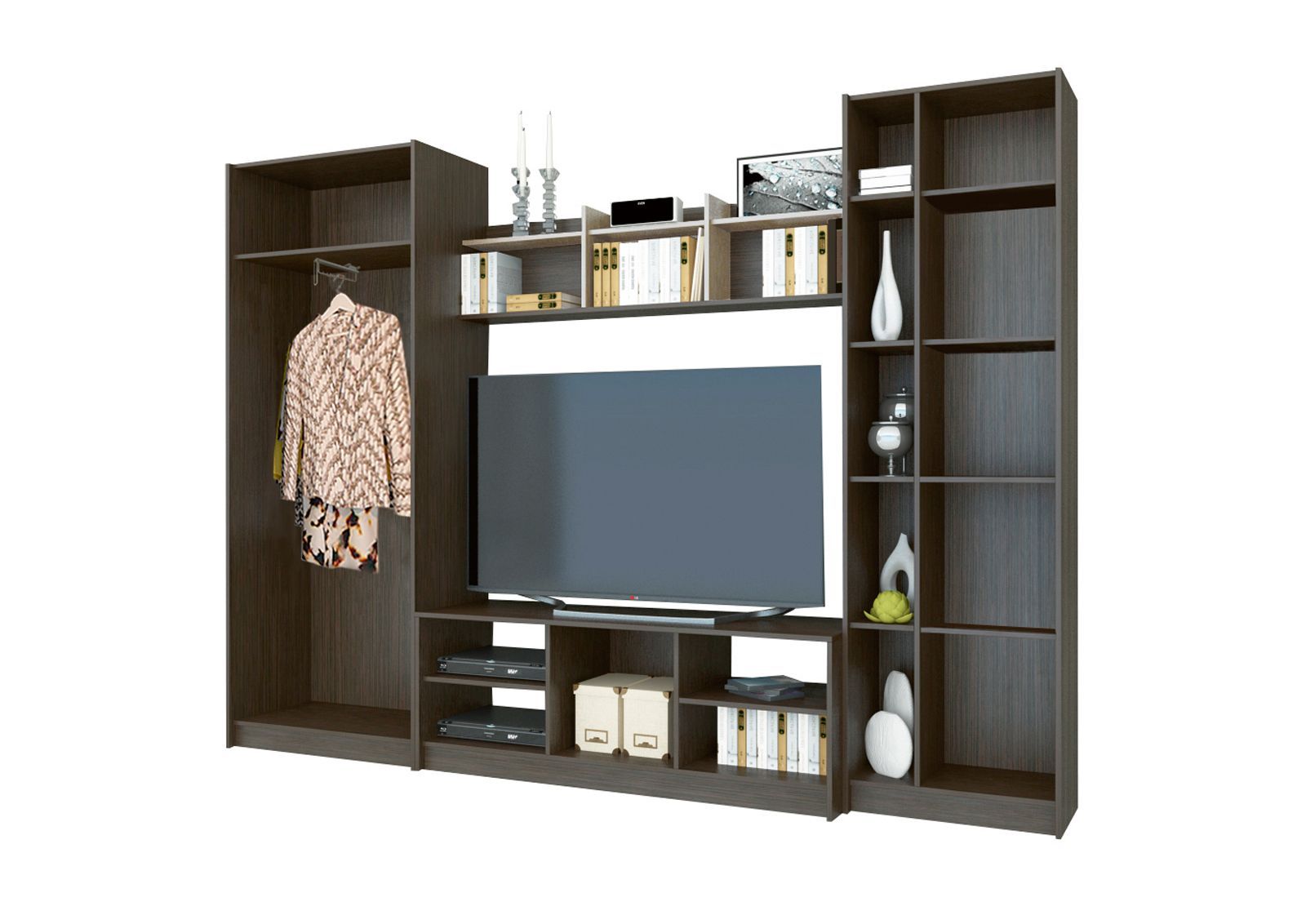 2. Функциональность. В состав гостиной входят все необходимые элементы мебели для комфортного использования: шкаф для одежды, тумба под телевизор, полки для книг и т.д.