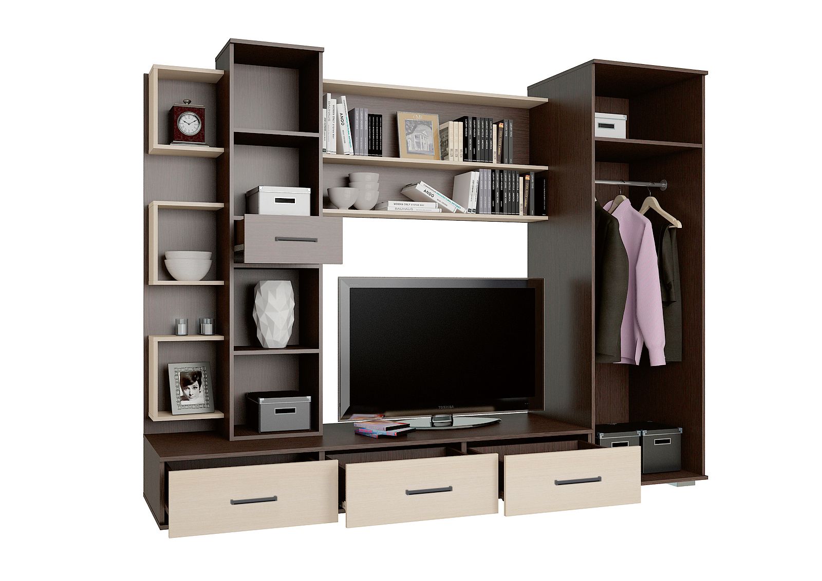 2. Функциональность: гостиная оснащена всем необходимым для комфортного использования. В ней есть места для хранения вещей, полки для книг и аксессуаров, а также тумба под телевизор.