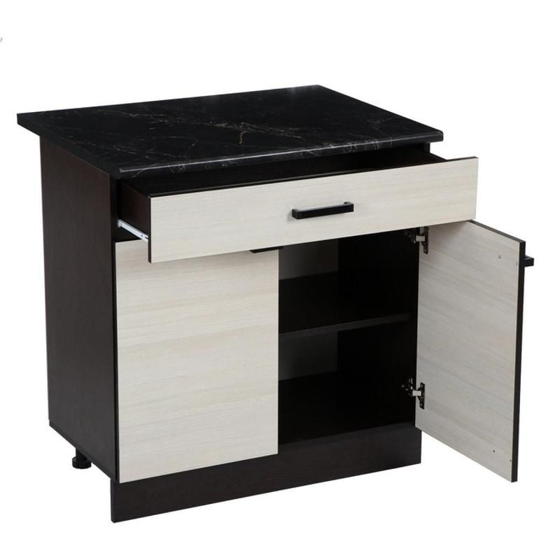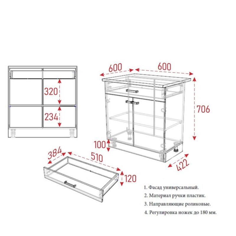 Размеры шкафа составляют 600 мм (ширина) х 450 мм (глубина) х 840 мм (высота), что делает его идеальным решением для хранения кухонной утвари, продуктов питания и других кухонных принадлежностей. Шкаф имеет ящик для хранения, что делает его использование еще более удобным и практичным. Цвет столешницы может быть Мальва или Мрамор чёрный.