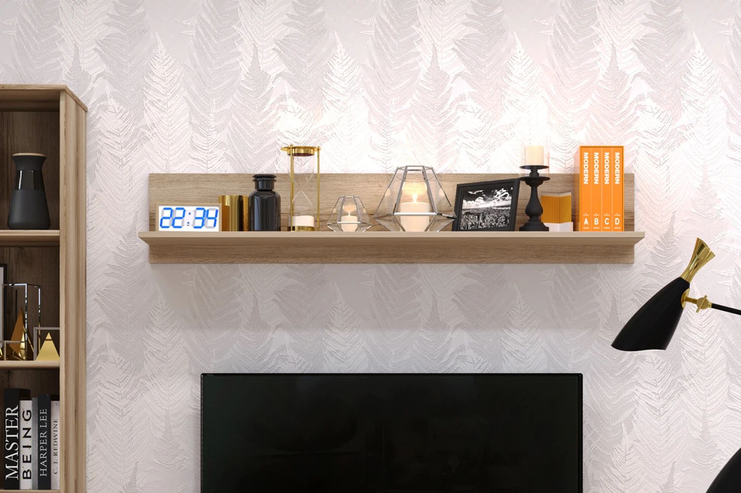 - небольшие габариты позволят не загромождать пространство, при желании вы можете купить несколько полок для создания композиции стенки в гостиную. На выбор в коллекции представлены полки шириной 900 и 1350 мм.