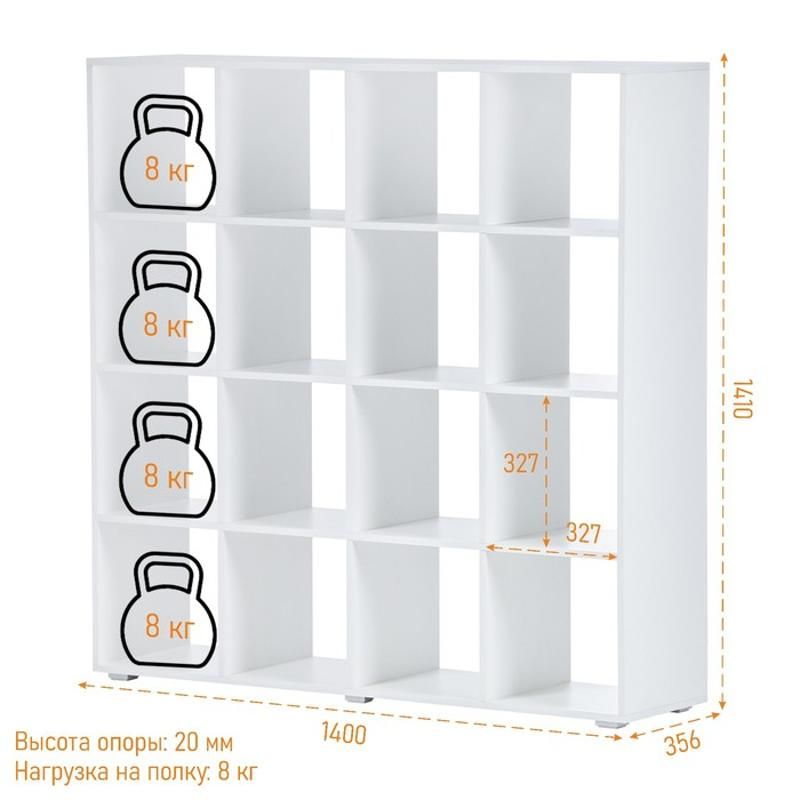 Стеллаж имеет размеры 1400 мм x 356 мм x 1410 мм и вес брутто 54.1 кг. Он имеет 16 полок, размещенных на расстоянии 327 мм друг от друга, что позволяет удобно разместить различные предметы, будь то книги, декоративные элементы или офисное оборудование.