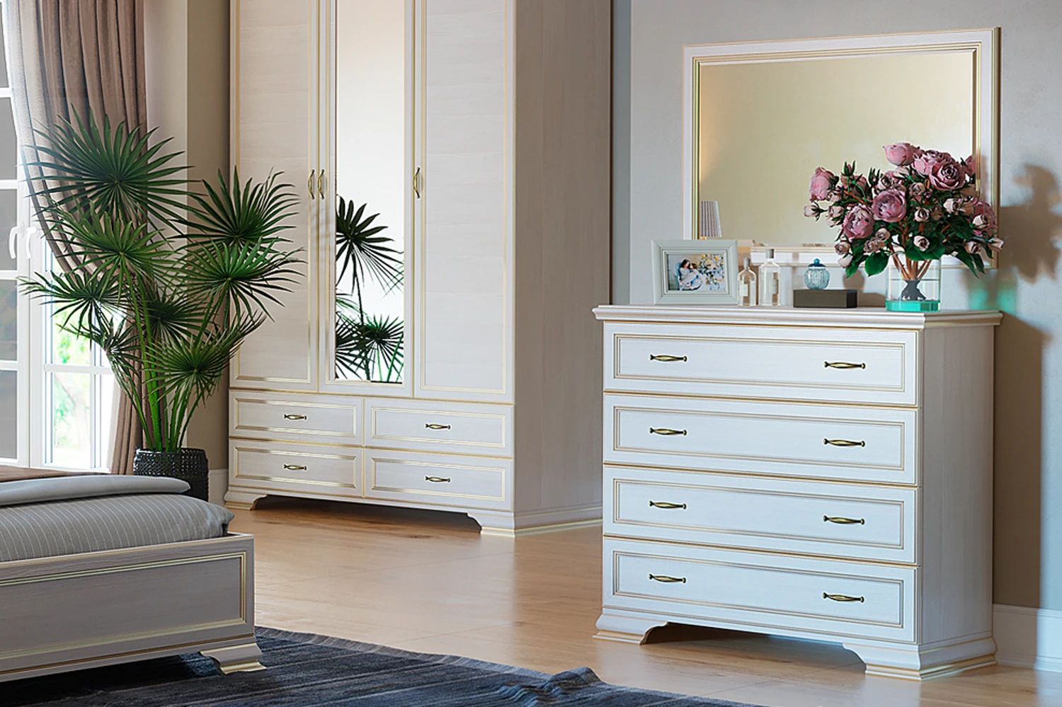 В основе изделия ЛДСП в профиле МДФ в пленке ПВХ «Бодега белый», рельеф фигурного профиля повторяет золотая патина. Светлая цветовая гамма с текстурой дерева легко сочетается практически с любым цветом стен.